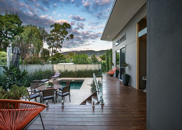 Stepping outside large glass sliding doors that lead out to the outdoor Alfresco area complete with a ceiling heater if needed which is a great area to relax on the retro lounge chairs. In addition, there is a large outdoor table, Weber Q BBQ, huge cantilevered umbrella and sun lounge chairs in the paved area beside the pool which is perfect for entertaining and watching children.