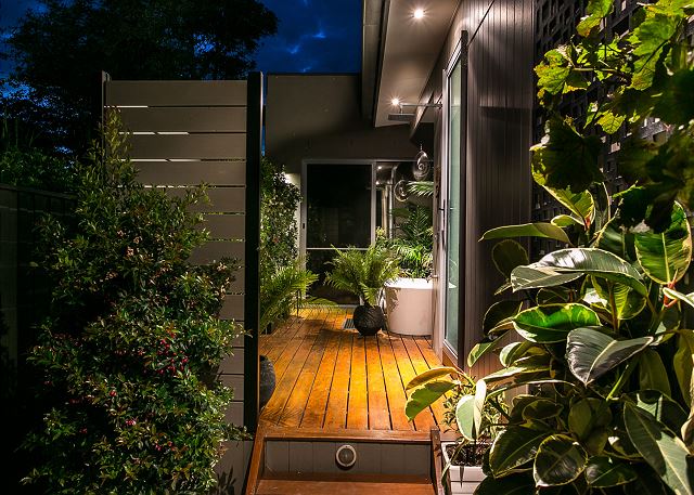 In addition, there is an outdoor shower which has both cold and hot water taps. There is a seating area complete with dining chairs and dining table in the shade of a mature willow myrtle tree hedged with a giant living wall of bamboo which makes for the perfect adults only private sanctuary.