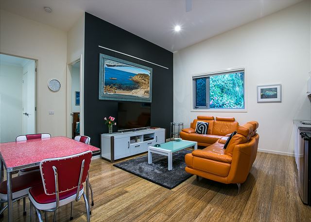 There is a large living area complete with a kitchenette (no cooking facilities are available here) large plasma TV, 2 bedrooms both with queen beds and large bathroom. For comfort, there is a large split air conditioner and both bedrooms have ceiling fans. There is a separate toilet as well.
